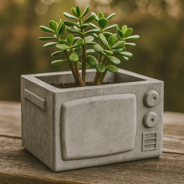Una pieza original y divertida que combina lo industrial con lo natural. Fabricada en cemento texturado, imita la forma de una tv retro, transformada en una maceta moderna y creativa. Ideal para decorar cocinas, livings o espacios con estilo minimalista o vintage.
