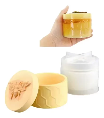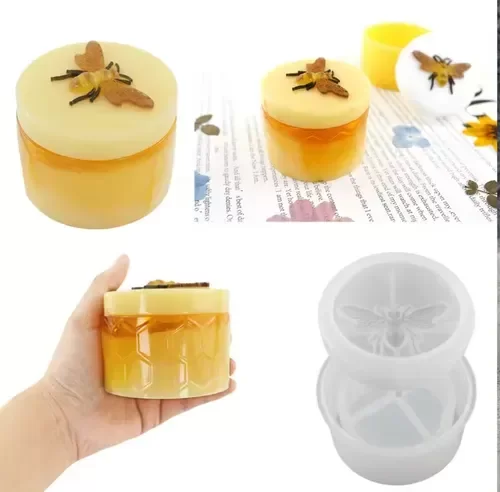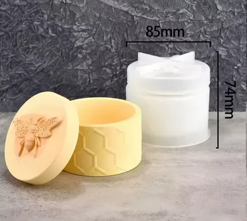 Molde cilíndrico para hacer un frasquito con textura de panal y tapa con abeja en relieve. Ideal para velas con tapa, joyeritos, sales de baño, cremas sólidas o decoración.