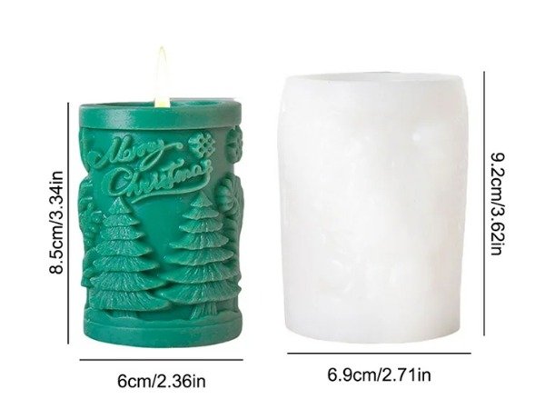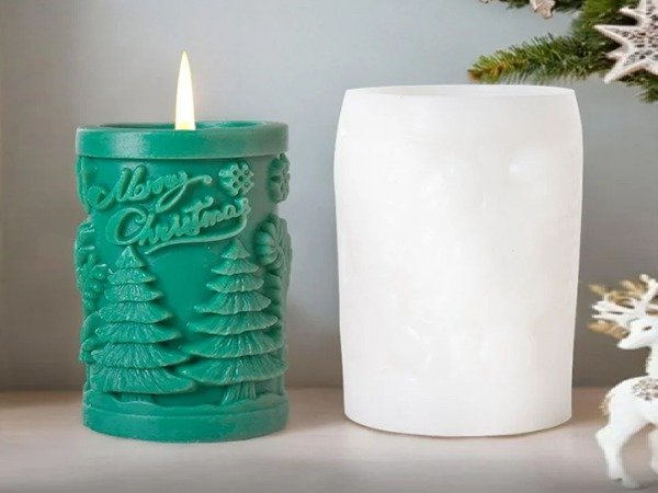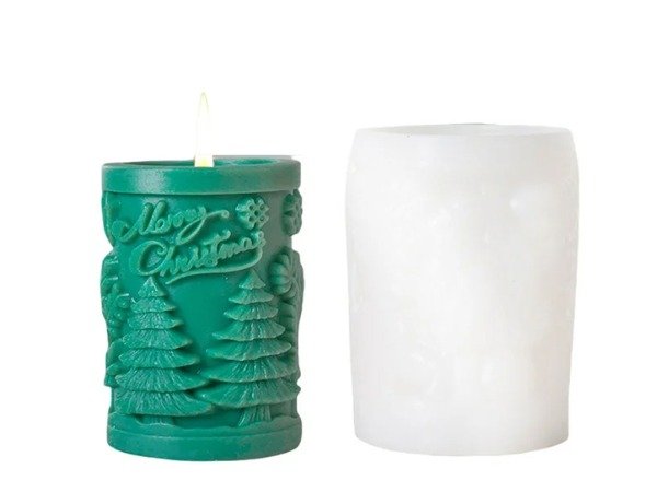 Molde de silicona flexible para crear un velón cilíndrico con relieve navideño: texto “Merry Christmas”, pinitos, copos y detalles decorativos alrededor. Ideal para cera (soja, parafina o blends) y también compatible con resina/jesmonita/yeso para piezas deco sin mecha. Entrega gran definición y terminación prolija.