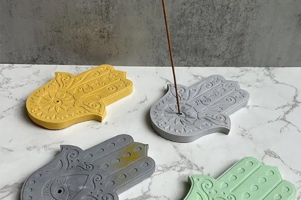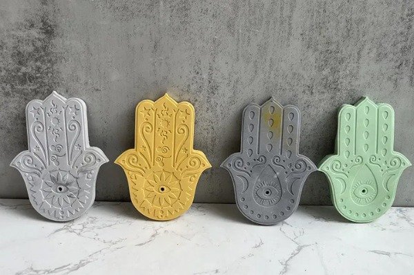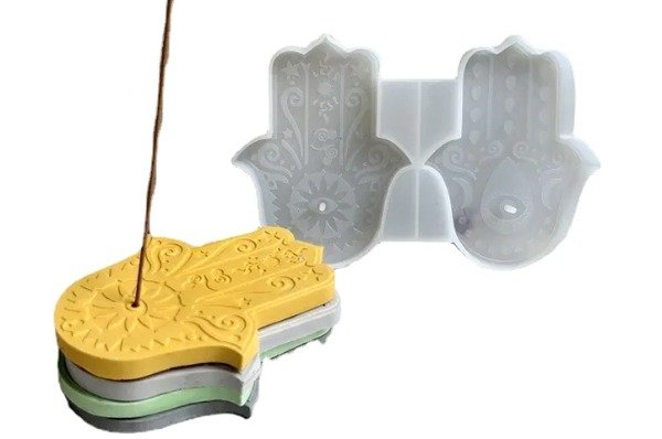 Molde de silicona flexible para crear porta sahumerios con forma de Mano de Fátima/Hamsa, con relieves decorativos (ojo, arabescos y estrellas) y orificio central para varillas. Ideal para cemento, resina epoxi, jesmonita o yeso, logrando piezas prolijas, con gran definición de detalle y estética espiritual/boho.