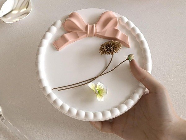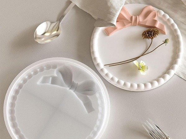 Bandejita circular con borde de “perlitas” y moño en relieve: ideal para joyero, porta-velas o platito decorativo.