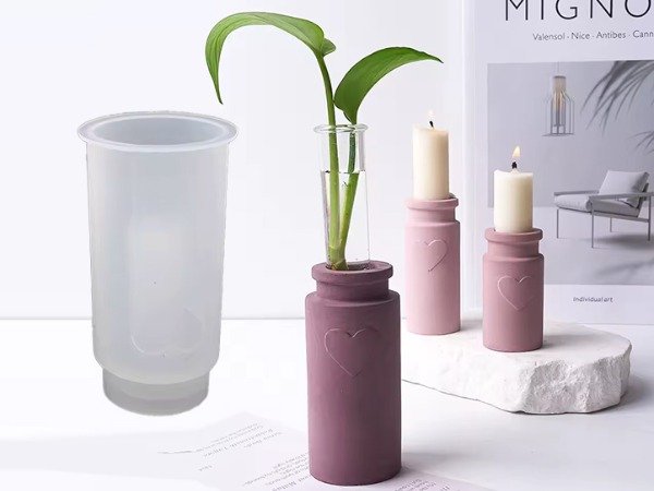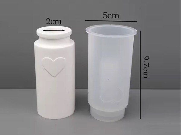 Molde de silicona flexible para crear una botellita cilíndrica con relieve de corazón al frente y cuello corto. Ideal para jesmonita, cemento, resina epoxi o yeso, logrando piezas prolijas y súper decorativas. También puede usarse como portavela de pilar fino.