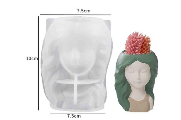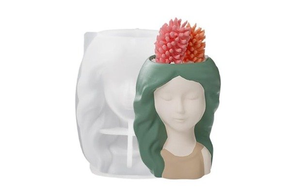 Molde de silicona flexible para crear una maceta decorativa con forma de cabeza femenina y cavidad superior. Ideal para jesmonita, cemento, resina epoxi o yeso, logrando piezas prolijas y súper decorativas para rincones y escritorios.