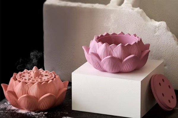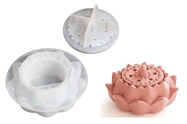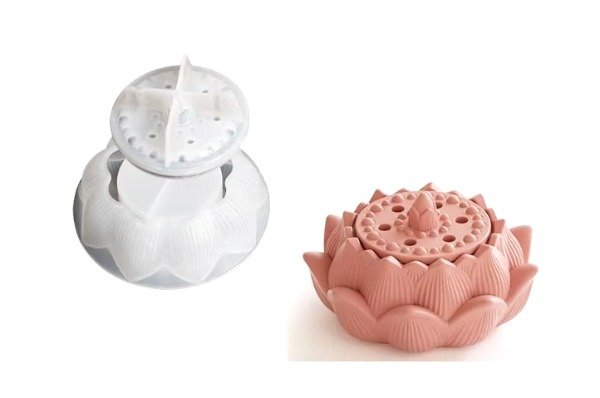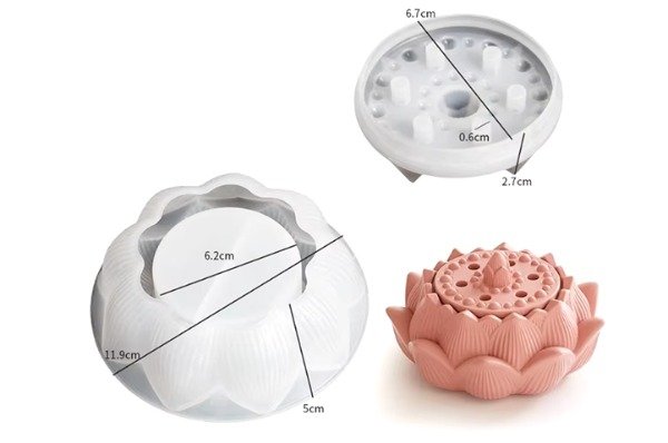 Molde 3D con tapa calada que simula una flor de loto. Ideal para cemento fino, yeso cerámico, resina epoxi, cera (para usar como velón con tapa decorativa) y jabón.
